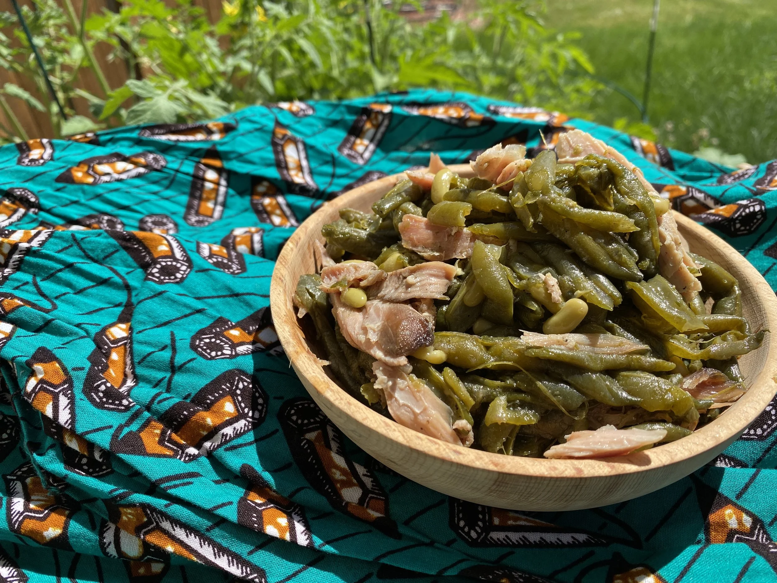 Remove the smoked turkey wing and tear the meat off the bone. Add smoked turkey meat back to the green beans.