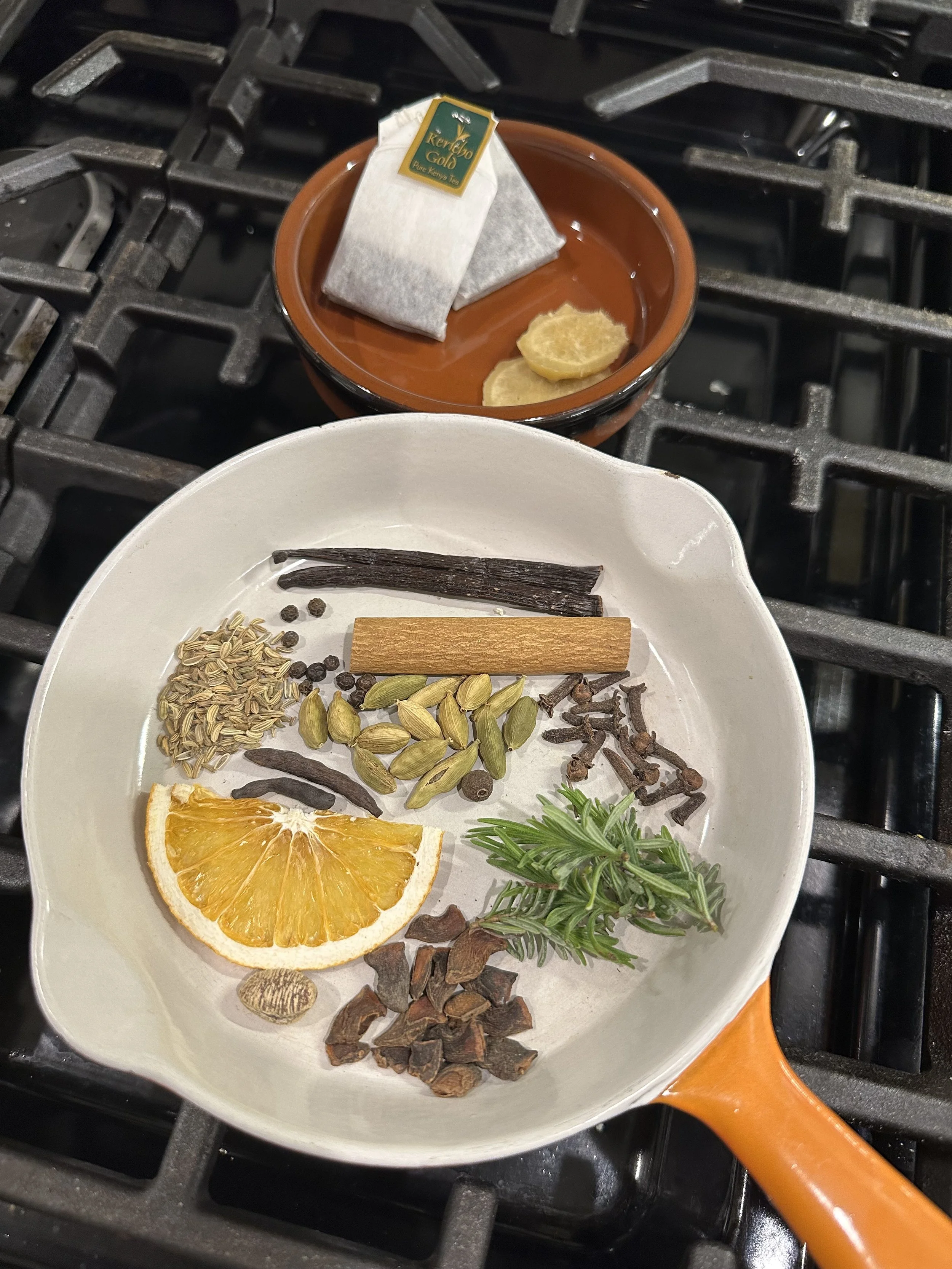 Pour spices back into pot. Add in nutmeg, ginger, vanilla bean pods, orange, lavender leaf, and tea bags.