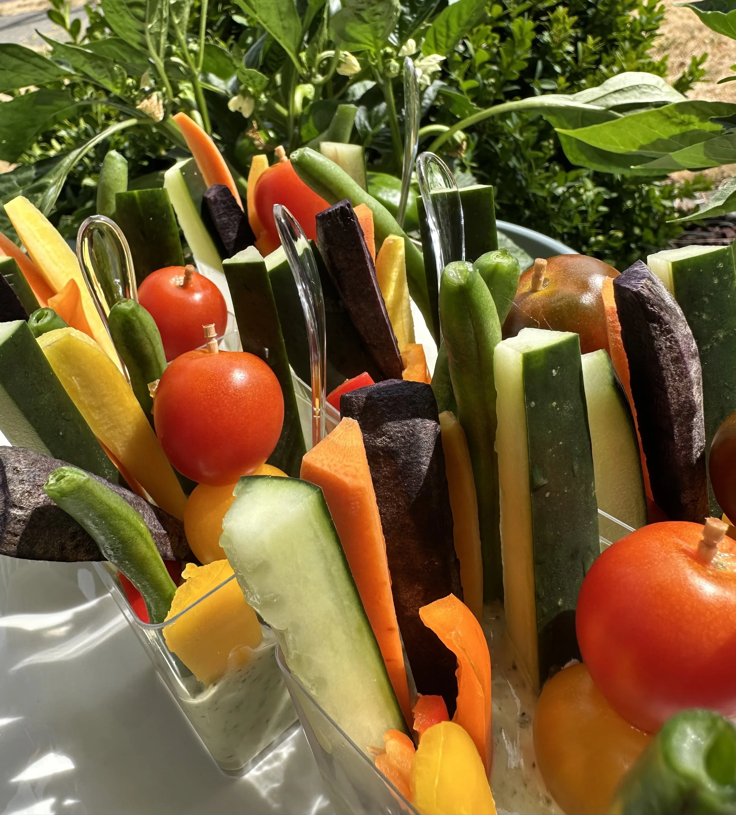 Arrange a colorful mix of veggie sticks in each cup, standing upright in the pesto ranch. Add 1 cherry tomato skewer to each cup for garnish.