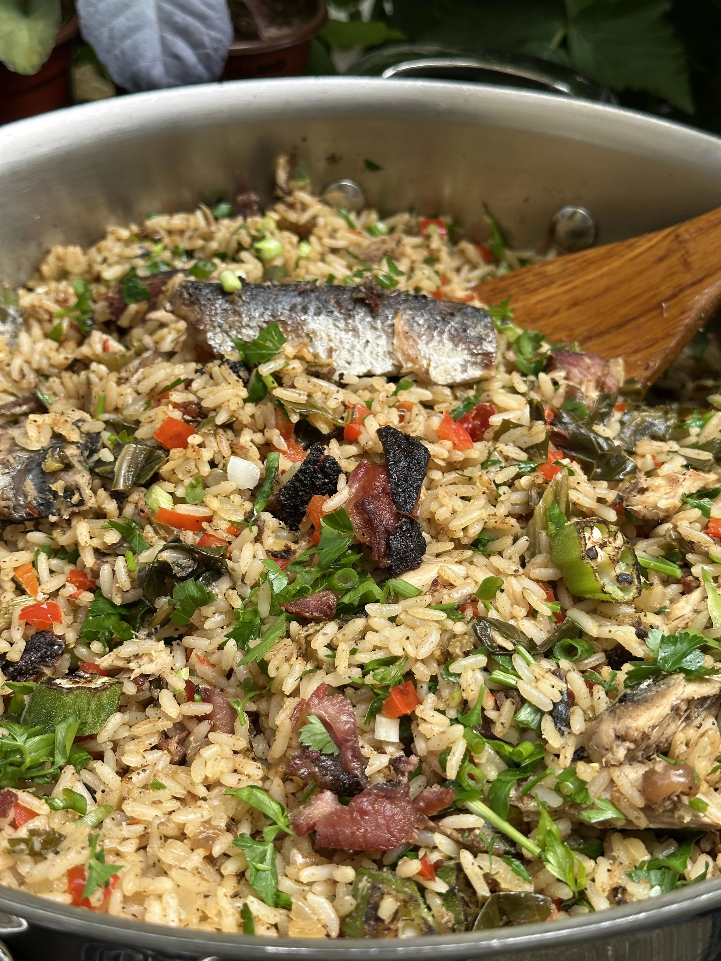 Once rice is nicely toasted and everything is coated with the seasonings, add in okra, parsley, and green onions. Turn off heat.